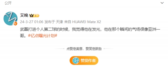 賽后,南方日報記者朱小龍更新社媒:武磊打進個人第二球的時候,我覺得他在發光,他在那個瞬間的氣場很像亞洲一哥。