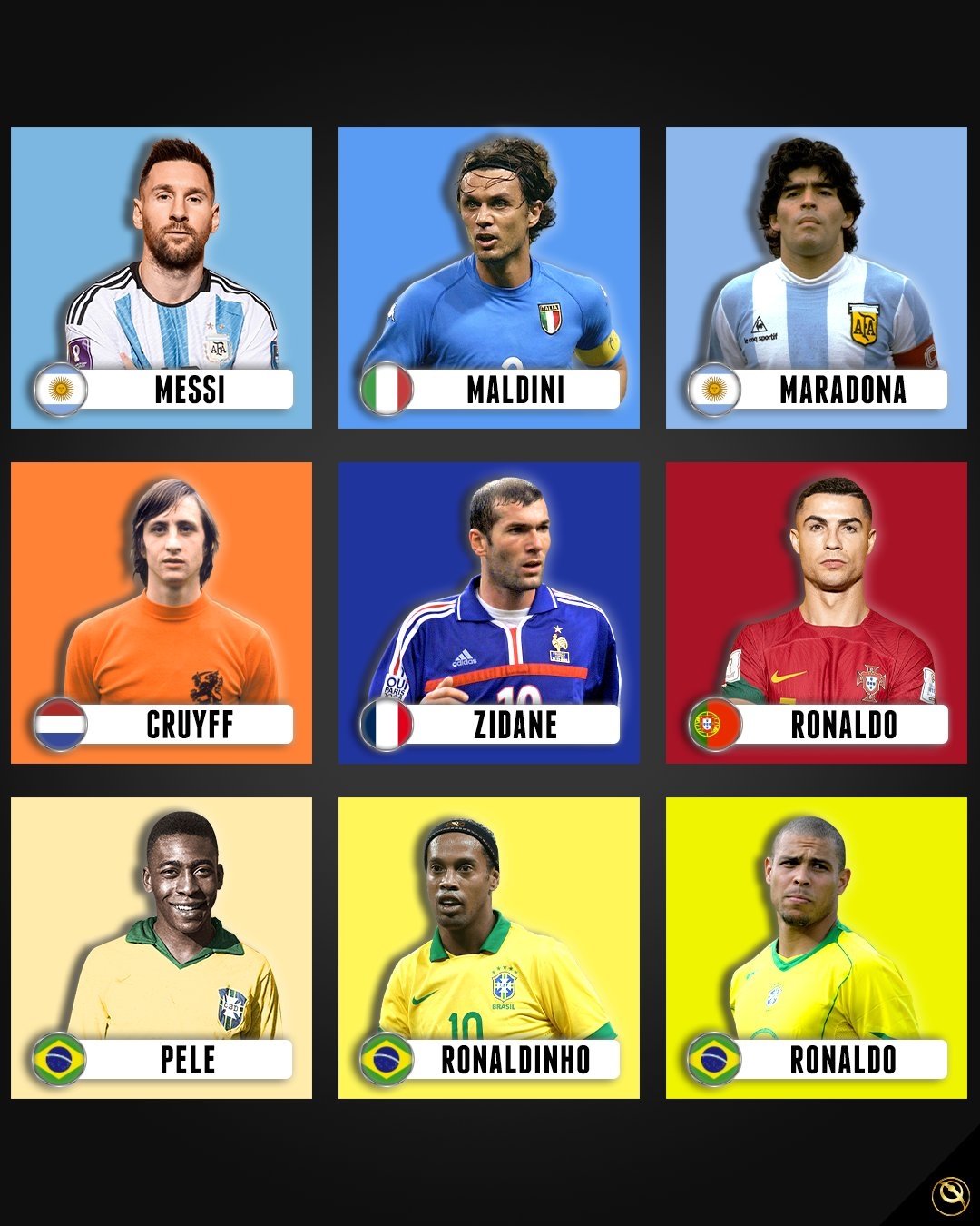 3月27日訊 外媒發布了九大傳奇球星海報,分別為貝利、馬拉多納、克魯伊夫、大羅、小羅、齊達內、馬爾蒂尼、梅西、C羅。