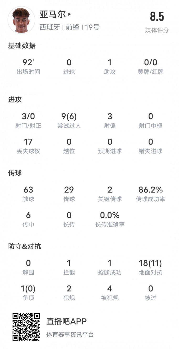 亞馬爾本場比賽數(shù)據(jù):1助攻2關鍵傳球6過人成功,評分8.5