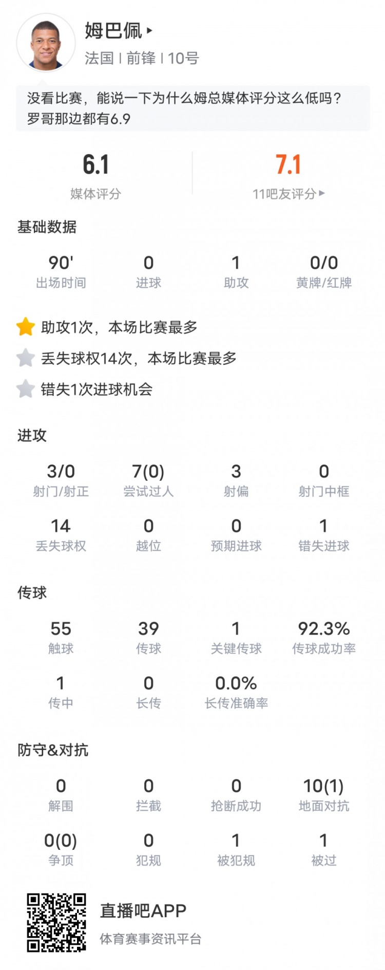 姆巴佩本場比賽具體數據如下: