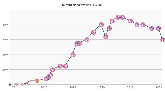 值得一提的是,這并不是基米希職業生涯身價下降最多的一次,在2020年夏天,基米希的身價曾經從8000萬歐降至6400萬歐。但是不到一年,基米希的身價就漲到了9000萬歐,這也是他生涯的最高身價。