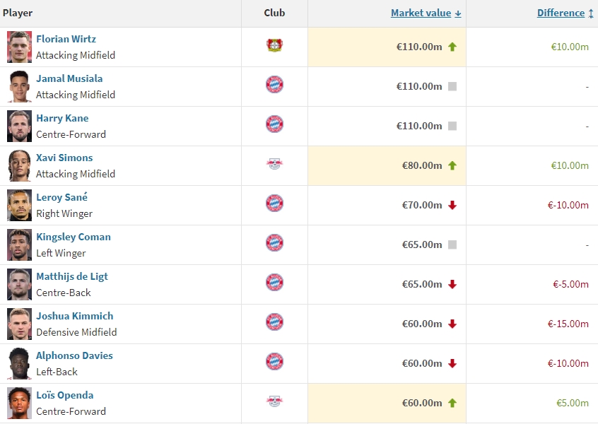 03月27日訊 德國轉會市場今天更新德甲球員身價,目前德甲身價前十的球員如下。