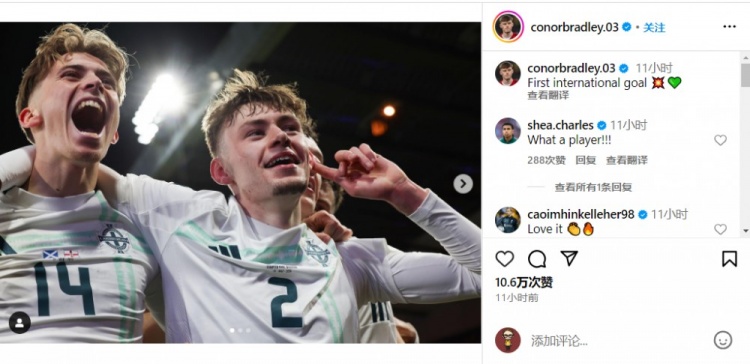 3月27日訊 利物浦小將布拉德利今天在Instagrqam發文,慶祝自己的首個成年國家隊進球。