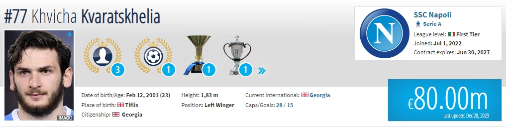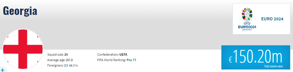格魯吉亞全隊26人的德轉總身價為1.502億歐元,頭號球星克瓦拉茨赫利亞身價8000萬歐元,門將瑪瑪達什維利身價為3500萬歐元,中鋒米考塔澤身價900萬歐元,其他球員最高300萬歐元。