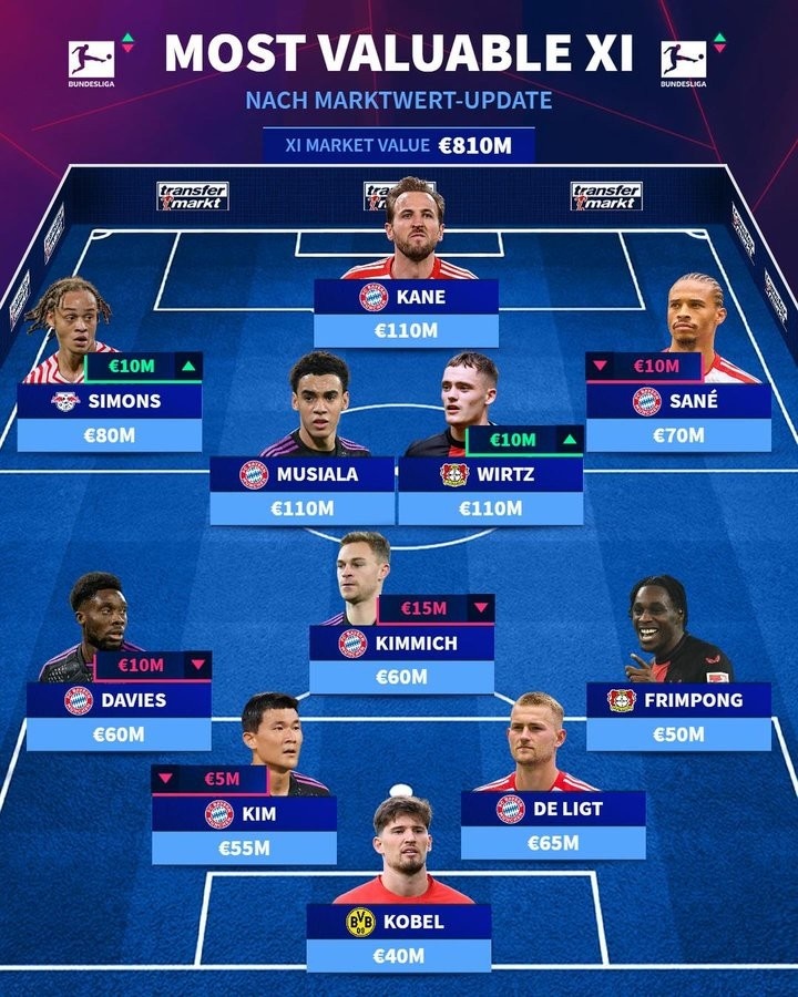 德轉(zhuǎn)更新德甲最貴陣:總身價(jià)8.10億歐元