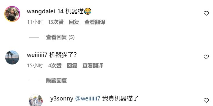 賽后,劉洋更新社媒,自嘲求推薦一款好耳機(jī),王大雷在評論區(qū)寫道:“機(jī)器貓”,韋世豪則評論道:“機(jī)器貓了?”劉洋回復(fù):“我真機(jī)器貓了”,兩人是在調(diào)侃劉洋和機(jī)器貓一樣沒耳朵。