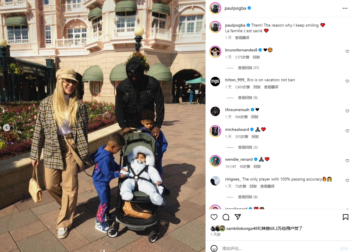 博格巴在社交媒體上曬出與家人的合照,并寫道:“他們是我保持微笑的原因??家庭是神圣的。”