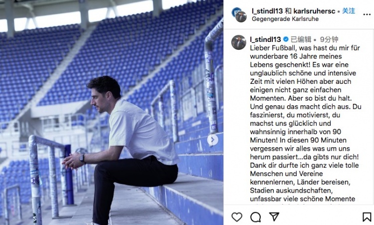 施廷德爾在Instagram上寫道:“親愛的足球,你給了我生命中多么美好的16年時光!這是一段無比美好和緊張的時光,有許多高光,但也有一些困難的時刻。但這就是你,這就是你的與眾不同之處。你讓人著迷,你激勵著我們,你讓我們在90分鐘的時間里快樂與瘋狂!在這90分鐘里,我們忘記了周圍的一切......只有你!”