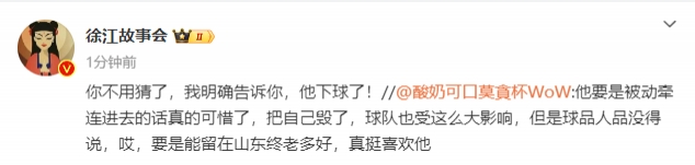 球迷:他要是被動牽連進去的話真的可惜了,把自己毀了,球隊也受這么大影響,但是球品人品沒得說,哎,要是能留在山東終老多好,真挺喜歡他