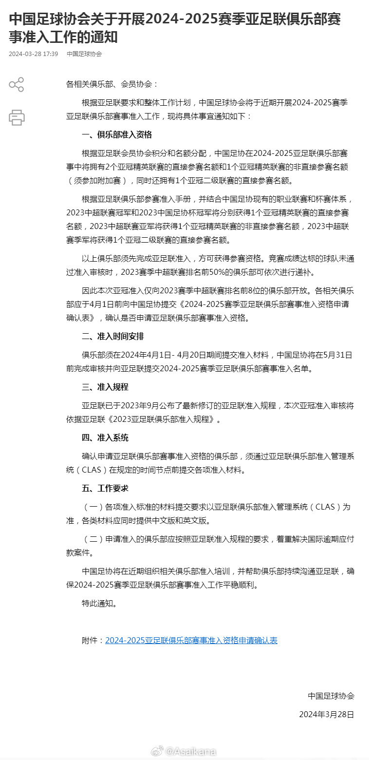 2024-2025賽季亞足聯俱樂部賽事準入工作即將開始。上海海港、上海申花有資格參加亞冠精英聯賽小組賽,山東泰山有資格參加附加賽。浙江隊有資格參加亞冠2聯賽。???四隊需要通過準入才能正式參賽。國際糾紛案件將是準入審查的重點,如有尚未解決的國際案件將嚴重影響準入結果。未獲得準入的情況下,將會順序遞補。四隊以外的、獲得2023賽季中超前8名的俱樂部也可以報名參加準入審查,當前四隊有隊未準入時,其他通過準入的球隊將會遞補參賽。除了參賽四隊,其他前8名球隊為成都蓉城、上海申花、北京國安、武漢三鎮、天津津門虎。這些隊需要先報名確認同意參加準入審查,然后再按亞足聯要求進行線上準入材料的提交。