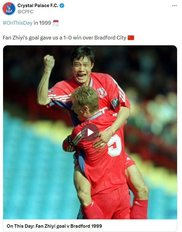 3月28日訊 今日,水晶宮官推更新,曬出25年前的今日“范大將軍”用自己標志性的大力遠射破門,助球隊1-0擊敗布萊德福德的場景。